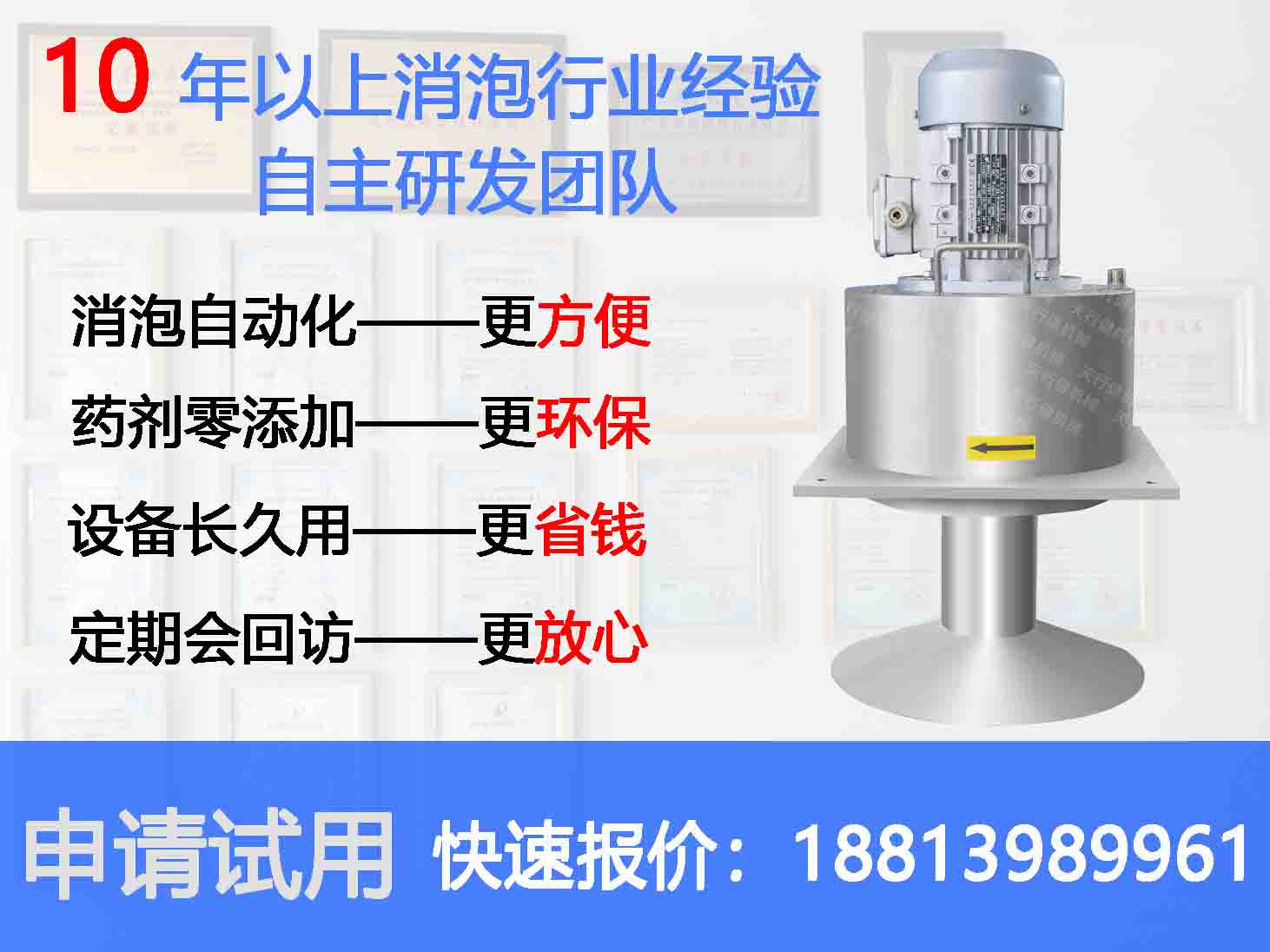 隨著社會(huì)不斷的進(jìn)步,方便,環(huán)保的消泡方式已經(jīng)是未來的發(fā)展趨勢了,沒使用過不要緊,可以先試用一下,相信天行健消泡器不會(huì)讓你失望的!如果有消泡方面的需求或者對(duì)消泡器有疑問的,可以隨時(shí)聯(lián)系我們,電話:18813989961(微信同號(hào))。